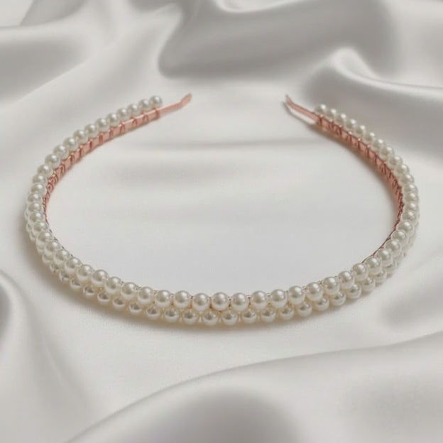 A refined double‑row pearl headband crafted for modern Australian brides who love a clean, soft‑luxury look. Made with premium glass pearls in a soft white tone — perfectly balanced between bright white and natural ivory — it photographs beautifully and maintains its colour without yellowing over time.