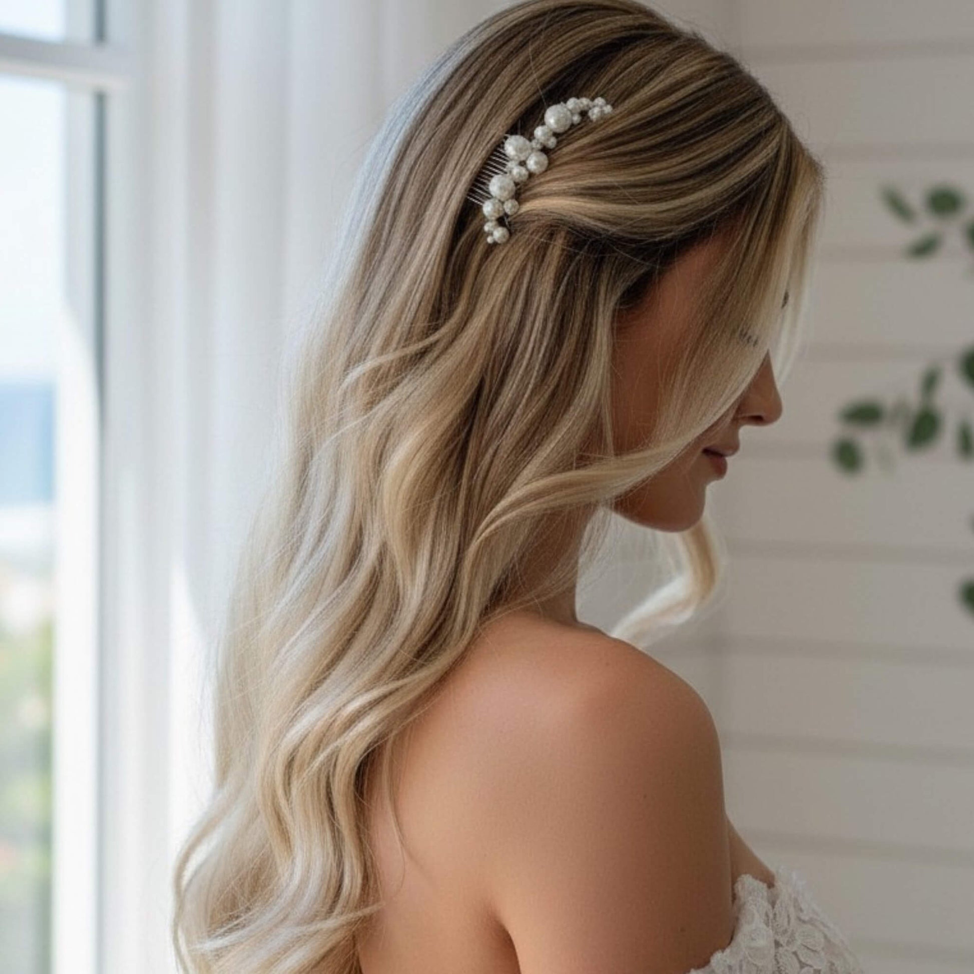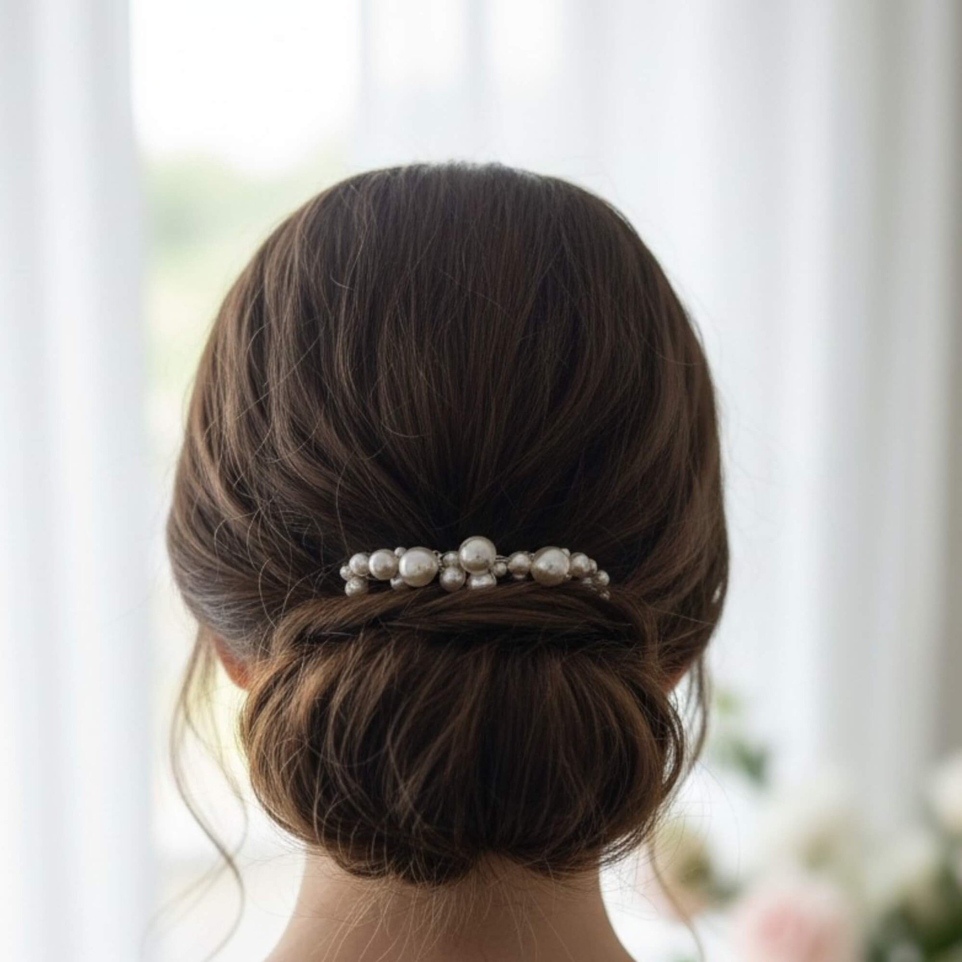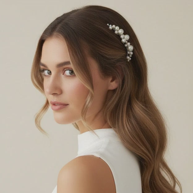 Beautiful for low buns, sleek ponytails, half‑up twists or soft waves. The curved pearl arc sits naturally above a ponytail or at the centre of a half‑up style, adding a subtle, premium highlight without overpowering the look.
