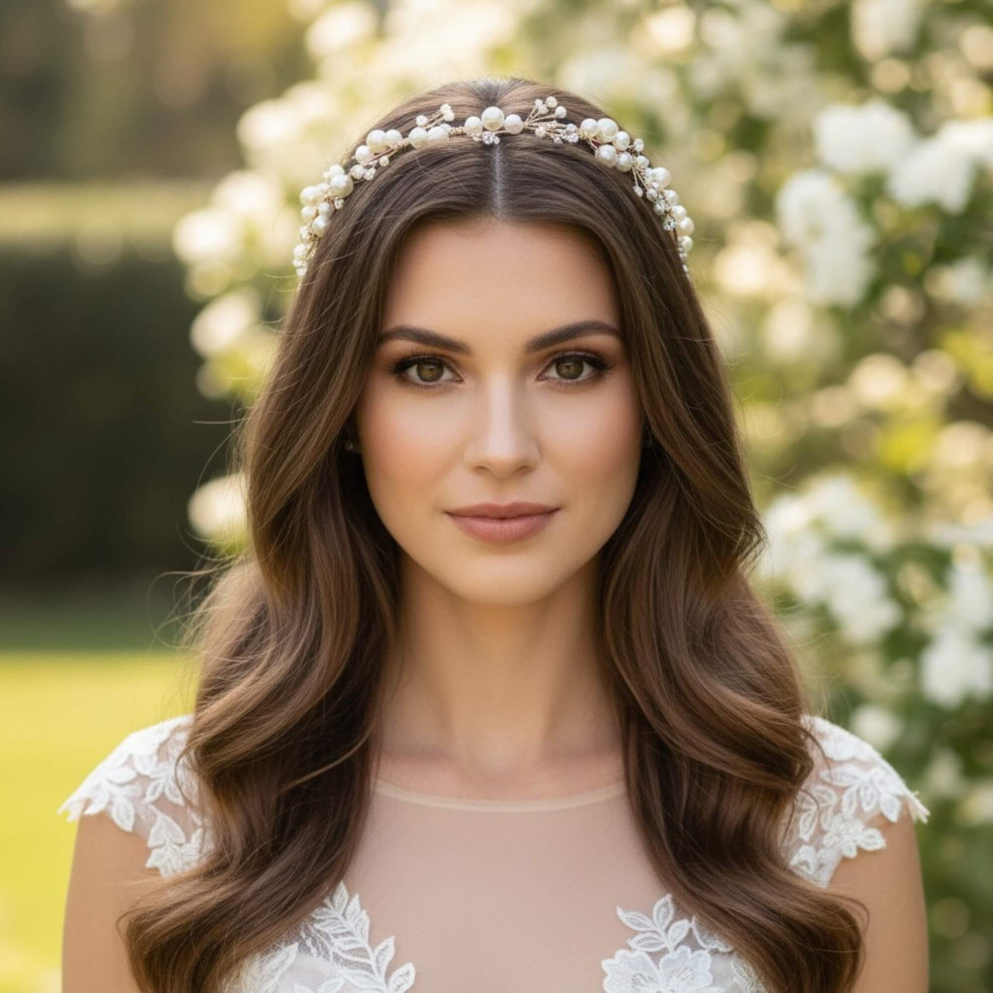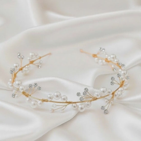 A softly luminous bridal headband crafted for modern Australian brides who love refined, feminine elegance. Featuring delicate pearl clusters and crystal accents, this floral‑inspired design adds a gentle glow to your bridal look — romantic, effortless and beautifully understated.